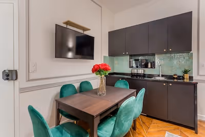 Located in a historic building, the apartment has been completely redesigned to offer contemporary comfort, blending the charm of the past with modern conveniences. It's just a few minutes' walk from the Louvre Museum and the lively Marais neighborhood. The apartment features typical Parisian parquet flooring. Its colorful decor, enhanced by a palette of green and black-and-white tones, gives it a welcoming atmosphere, and its two bedrooms and two bathrooms make it the ideal place to explore Paris!